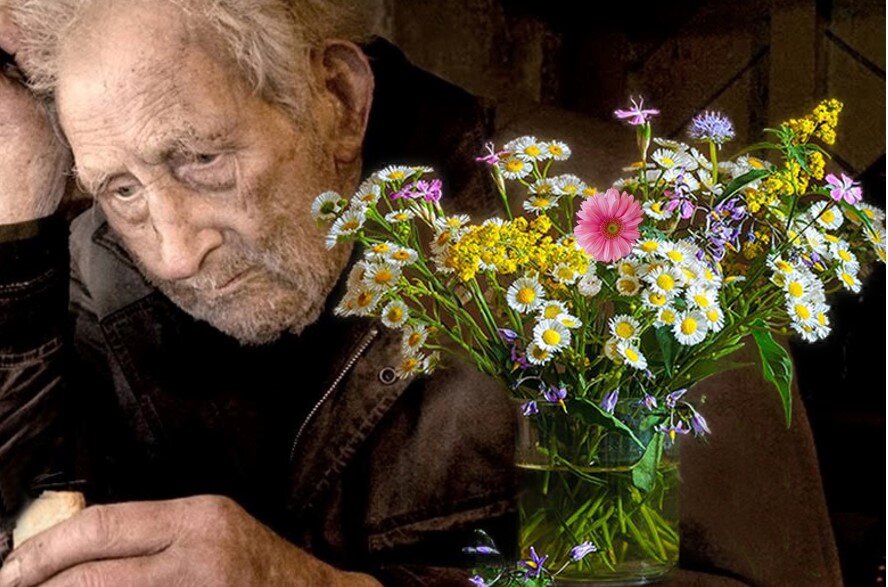 Стебли цветов мокли в поллитровой банке, а старик придерживал ее трясущейся рукой. Зрелище было из ряда вон жалким. Мимо спешили люди, никто даже не глядел в его сторону.