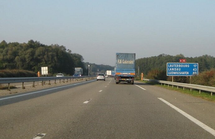 Пересечение французской границы почти незаметно. Один только знак европейского союза. К тому же Франция и Германия делятся в этом месте рекой Рейн. Проехал по мосту и уже во Франции. Только со временем замечаешь, что и сама автотрасса и мелькающие вдоль населённые пункты становятся несколько «скромнее», чем в Германии. Трасса А35, на указателях мелькают французские названия Lauterbourg, Landau. Но и немецкие тоже, - по направлению – Ludwigshafen, например. В стороне остаётся Страсбург. По дороге едут вперемешку автомобили с французскими и немецкими номерами. Европа.