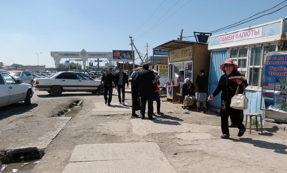 Первое своё впечатление я бы сформулировал так: "ужас - да, но не ужас-ужас-ужас!": казахско-киргизский Кордай мне показался гораздо хуже, особенно с киргизской стороны. Здесь, правда, своя особенность - во-первых, обилие обменных пунктов, учитывая заморочки с декларацией и обменом валют в тогдашнем Узбекистане (тенге по выезде продают, кстати, довольно выгодно).