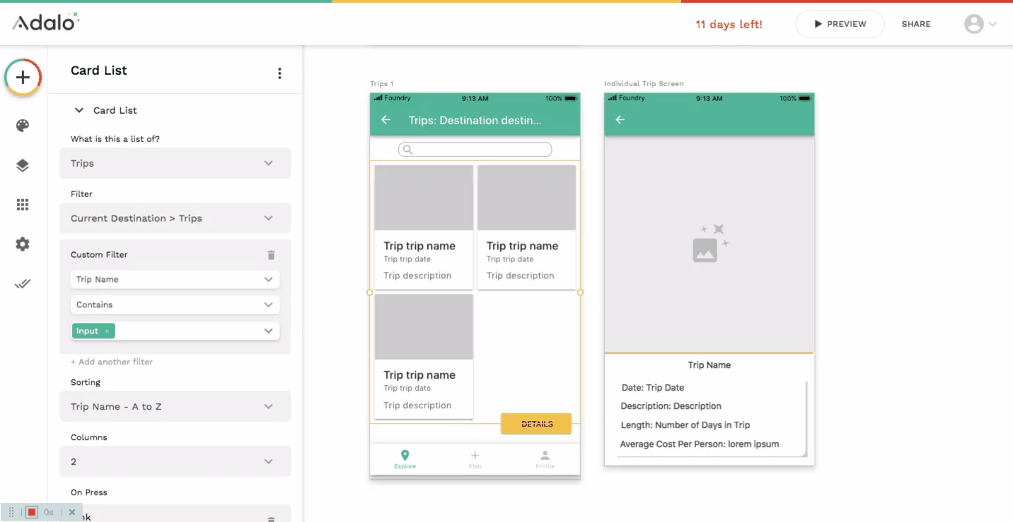 Почти в каждом приложении есть хотя бы один экран со списком - будь то список поездок, пользователей, разговоров или чего-то еще. Прежде чем вы начнете работать со списками. Есть семь типов компонентов списка: Когда вы впервые добавляете компонент списка на экран, первая опция на левой панели - указать «Что это за список?» Здесь вы можете выбрать коллекцию в своей базе данных, к которой должен подключиться компонент. Оттуда вы можете привязать каждый из своих списков к своим коллекциям. Сортировка и фильтрация списков. Чтобы изменить способ отображения данных в списке. Если вы хотите, чтобы ваше приложение отображало только определенное подмножество ваших данных, вы можете создать фильтр данных. Например, возьмем приложение, над которым мы ранее работали, которое позволяет вам просматривать места для отдыха. Предположим, вы вводите все свои данные в коллекцию поездок со множеством свойств, одним из которых является критерий Истина / Ложь, описывающий, является ли поездка общедоступной