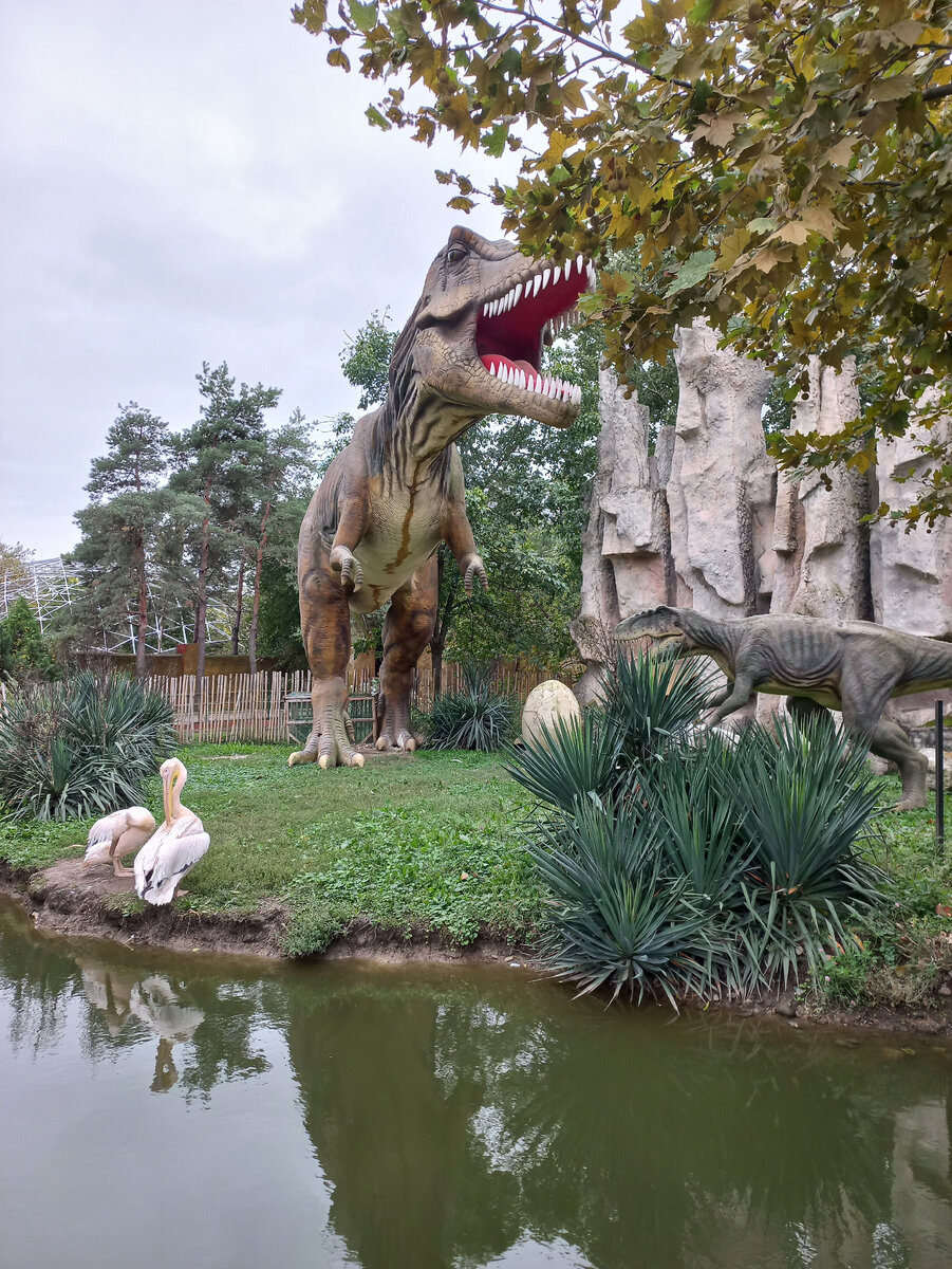 Краснодарский зоопарк. Нам удалось побывать в зоопарке с 1-8 октября по скидке в 50%. Стоимость билета без скидки составляет 700 руб взрослый и 500 детский. При входе в зоопарк нас встречает композиция динозавров и живых пеликанов. Спасибо охраннику который подсказал что можно пройти в закрытое помещение ( зимний зоопарк) и посмотреть: рыбок, крокодилов 🐊 , огромные пальмы и мини кафе. Закрытая зона понравилась очень. Сам зоопарк поделен на континенты нашей земли это очень крутая задумка. Но вот мы вышли на улицу и тут нас ждали разочарование жирафа нет, медведя нет, бегемота нет, и вообще половина вольер пустые ( надеюсь что животных убрали просто на зимовку). Самое большое впечатление на детей произвела территория динопарка, но не сами динозавры, а олени которые ходят по той территории свободно и их можно погладить и покормить. Олени очень милые. Спасибо зоопарке за возможность прикоснуться к этим чудо животным. Самая большая компания людей собралась около умницы обезьянки ко