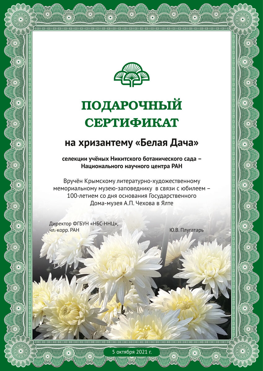 «Мемориальный сад Чехова сегодня называют живым памятником писателю. Известно, что здесь у него в большом количестве росли хризантемы и розы, которые он очень любил, — рассказывает кандидат биологических наук, заведующая отделом дендрологии, цветоводства и ландшафтной архитектуры Никитского ботанического сада Светлана Плугатарь. — И когда дирекция Крымского литературно-художественного мемориального музея-заповедника в лице Ларисы Ковальчук обратилась к нам с просьбой назвать один из сортов хризантемы селекции НБС «Белая дача» — все сочли это за честь».