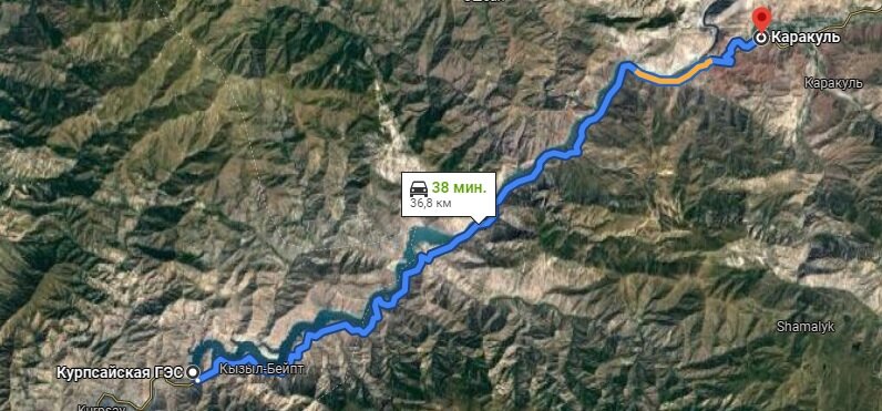Отдохнув на площадке перед туннелем около Курпсайской ГЭС, мы продолжаем путь. Все так же слева внизу Нарын несет свои воды, а справа стена гор. На одной из остановок, водитель говорит мне, можешь докинуть камень до реки? А что его кидать, вот она вода, совсем рядом. И я легонько кинул небольшой камушек. Удивился, но он даже близко не долетел до воды. Пришлось поднапрячься, чтобы камень долетел до цели. А казалось, вот она вода. у самых ног. Наверное, в горах, все обманчиво. И тут мимо нас проехал велосипедист! Вот это да, откуда же он и куда? Представил, сколько ему еще крутить педали и посочувствовал. А он. наверное, смеялся над нами мол, слабаки, все на машинах, да на машинах. А впереди нас ждали два туннеля, идущих один за другим (это можно увидеть на видео, в конце публикации) И вот мы, как я и писал в предыдущей публикации, въезжаем с яркого солнца,в темный туннель, а нам на встречу слепя фарами фура. Приятного мало. На противоположном берегу реки, иногда видна старая дорога.