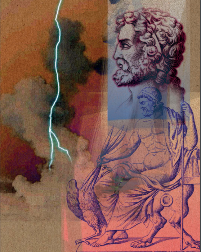 Зевс, бог неба, считался также покровителем общности людей. В Древнем Риме Юпитер еще в большей мере олицетворял государство и его непреодолимую военную мощь. Зевс, младший сын Кроноса и Реи, был женат на Гере, правда, он известен и своими любовными приключениями, которые привели к появлению множества потомков. Кронос, боясь быть низвергнутым, пожирал детей, рожденных Реей. Когда пришла очередь родиться Зевсу, Рея отправилась на остров Крит, где Зевс и появился на свет. А Кронос вместо младенца проглотил завернутый в пеленки камень. Зевса тайно воспитывали в пещере, и куреты били копьями в свои щиты, чтобы заглушить плач младенца. Зевс вырос, стал могучим и хитроумным. С помощью волшебного напитка он заставил Кроноса изрыгнуть всех проглоченных детей. Затем была титаномахия, или битва титанов, в которой благодаря молнии, созданной циклопами, Зевс с олимпийцами одержал победу. Несмотря на свою верховную власть, Зевс не был всемогущим. Ему бросали вызов другие боги, и он зависел от Судьб