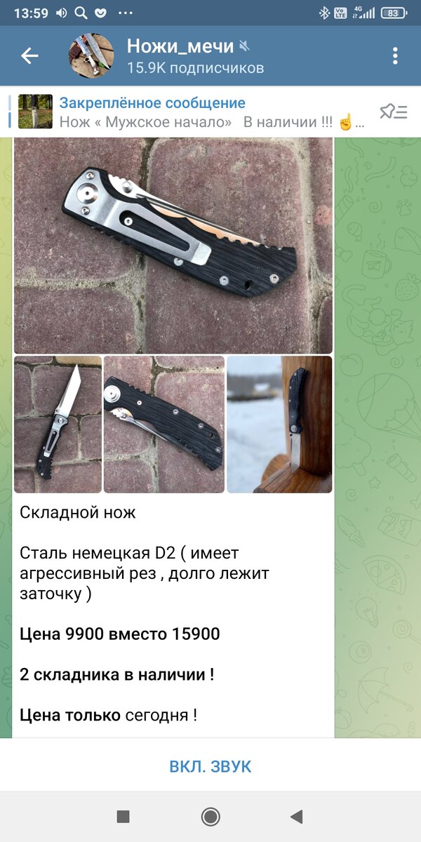 Как я попал в эту группу телеграмма, точно не вспомню. Возможно жмакнул какую-то ссылку. В этой группе идет продажа ножей от мастерской, справедливости ради , от какой мастерской... я так и не понял. Начинаю я пристально изучать ассортимент, много ножей которые привлекают внимание. Здоровенные БОУИ, Кинжалы Вермахта, Сабли, Мечи, Ножи, и всякое разное. Листаю я это все многообразие, захожу почитать коменты , где открыто, все восхищаются, хотят купить, а цены то надо сказать не кислые между прочим. Со скидками ножи Боуи 13000 р. А без все 26000 :) В ленте полно всего и вдруг ,прокручивая ленту, взор цепляется за складной нож. Я смотрю фотки, листаю их, читаю описание, смотрю на цену.... опять листаю фотки и опять смотрю на цену:) Смотрю и думаю красотища... А на деле я уже понимаю что я вижу... Но цена конечно не дает угомонится мыслям:)