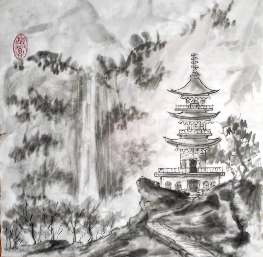 Вот я и написала Памир и буддийскую пагоду. Вдалеке - величественный водопад. К храму ведет лестница, символизирующая путь к просветлению...
