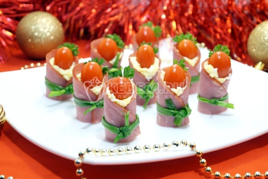 Ингредиенты: Сыр — 50 г Ломтик ветчины — 5-7 шт Помидоры черри — 10-12 шт Яйца — 2 шт Майонез — 2 ст. л. Зубчик чеснока — 1 шт Лук зеленый (перо) — 1 пучок Приготовление: Яйца отварить до готовности, остудить и очистить. В миску натереть сыр и яйца на мелкой терке. Добавить прессованный чеснок и майонез. Перемешать начинку. Ветчину нарезать тонкими ломтиками (или можно купить готовую нарезку). Разрезать на половинки каждый ломтик ветчины и скрепить перышком лука. Нафаршировать заготовки начинкой. Добавить маленькие помидорки. Украсить зеленью. Закуска «Помидор в Тулупе» готова. Подавать к столу.