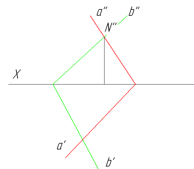 Нахождение линии пересечения плоскостей сводится к нахождению двух точек пересечения. Как говорилось в предыдущем уроке, плоскости могут быть заданы несколькими способами: параллельными прямыми, пересекающимися прямыми и следами. Проще всего найти линию пересечения плоскостей, заданных следами. В этом случае, линия пересечения находится как точки пересечения одноименных следов. Задание: построить линию пересечения заданных плоскостей a и b. Алгоритм построения линии пересечения плоскостей, заданных следами Начать построение можно как с горизонтальных следов, так и с фронтальных следов плоскостей. Итак, находим точку пересечения фронтальных следов плоскостей a и b, обозначим её N'', опустим перпендикуляр к оси Ox. Перпендикуляр полученный в первом действии является линией связи к горизонтальной проекции точки пересечения N'. Теперь найдем точку пересечения горизонтальных следов плоскостей, также находим обе ее проекции. Соединим соответствующие проекции точек пересечения и получим лини