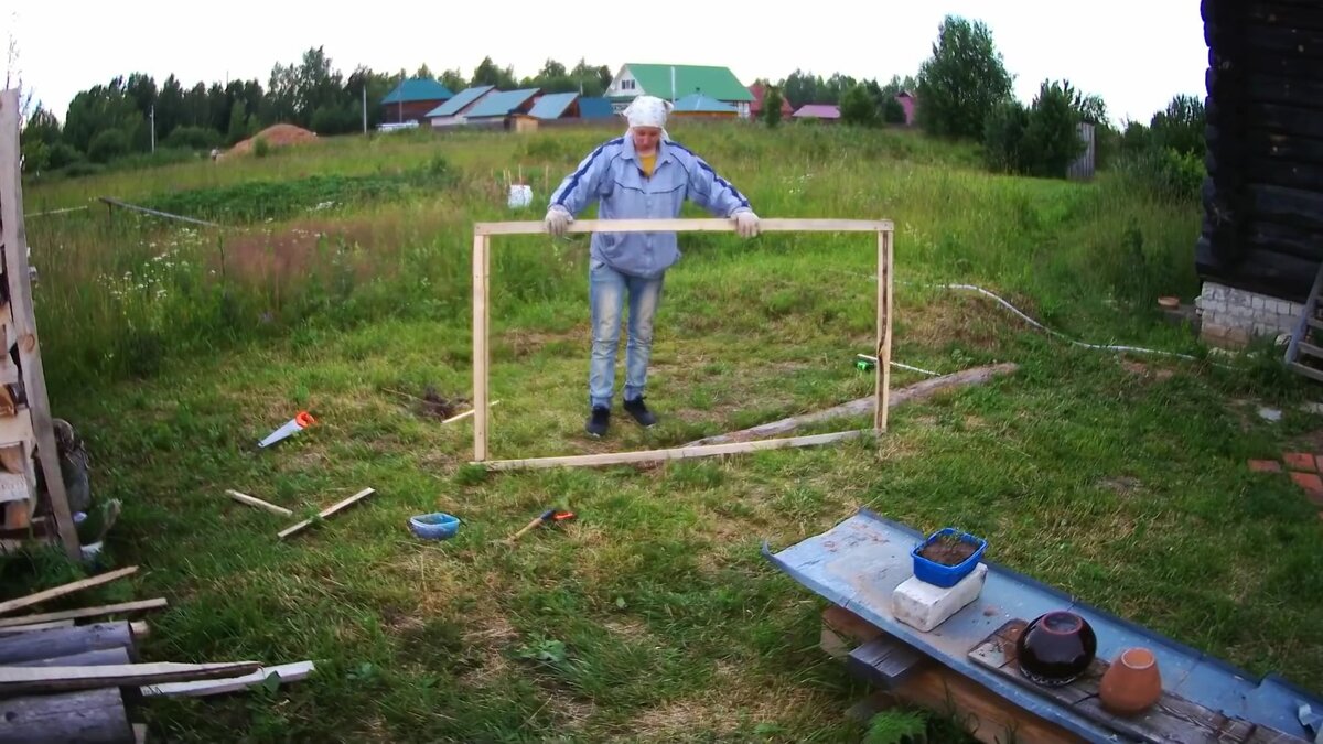 Всем привет! Сегодня я решил начать делать забор. И делать не обычный забор, а такой, чтобы можно было его снять и убрать на какое-то время. Потому что мне нужно во двор заехать трактором. Ну что, поехали! Сначала буду делать каркас. Обычно сначала столбы вкапывают, потом уже делают сам забор. У меня будет все немножко по-другому. В общем, сначала я каркас скреплю на саморезы, а дальше - на гвозди. Каркас готов, теперь буду делать обшивку у рамочки. Именно такой забор решил сделать, так как он больше всего доступен по моим возможностям. Я в общем никакие углы не вымеряю, просто так на глаз делаю. В общем, вот так у меня получилось. Сейчас отпилю ножовкой всё, что выходит за границы рамки. В итоге, вот такие узоры ромбики получились. Сейчас я буду делать столбы. Они будут у меня необычные, нужно сделать так, чтобы они снимались. Для того, чтобы столбы были съемными, я беру сантехнические пластиковые трубы диаметром 50 мм. Заранее подготовил ямки под длиной трубы. В общем, они просто буд
