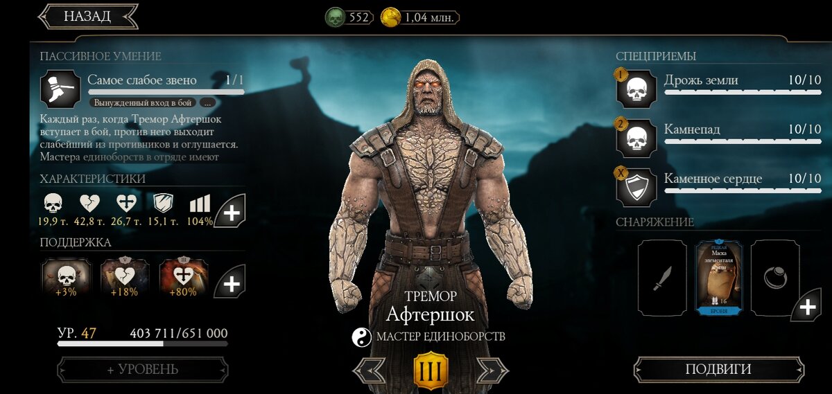 Пассивноая способность Тремора позволяет ему искать и уничтожать самого слабого персонажа в команде противника. При входе в бой Тремор выдерживает из команды соперника самого слабого противника и оглушает его, что даёт ему маневр для нанесения атак. Если в моменту вступления в бой Тремор накопил энергии для спецприёма 2, то у соперника нет шансов для блокировки мощнейший ударов. Рекомендуется объединить его с другими Мастерами боевых искусств, которые усиливают его атаку (например, Скорпион Ниндзюцу), чтобы эффективно устранить указанного противника. Частая смена бойцов в команде позволит нам без проблем одолеть противника он слабого до сильного. Тремор хорошо противостоит персонажам из преисподней. Против Тремора лучше применять таких персонажей как : Джонни Кейдж/ Mortal cup oн может оглушить команду Тремора, если они намерены поменяться. Соня Блейд/Mortal cup oна и ее товарищи по команде по Кубку Комбата невосприимчивы к оглушению. Кабал/MK11: Кабал может отражать оглушение Тремора