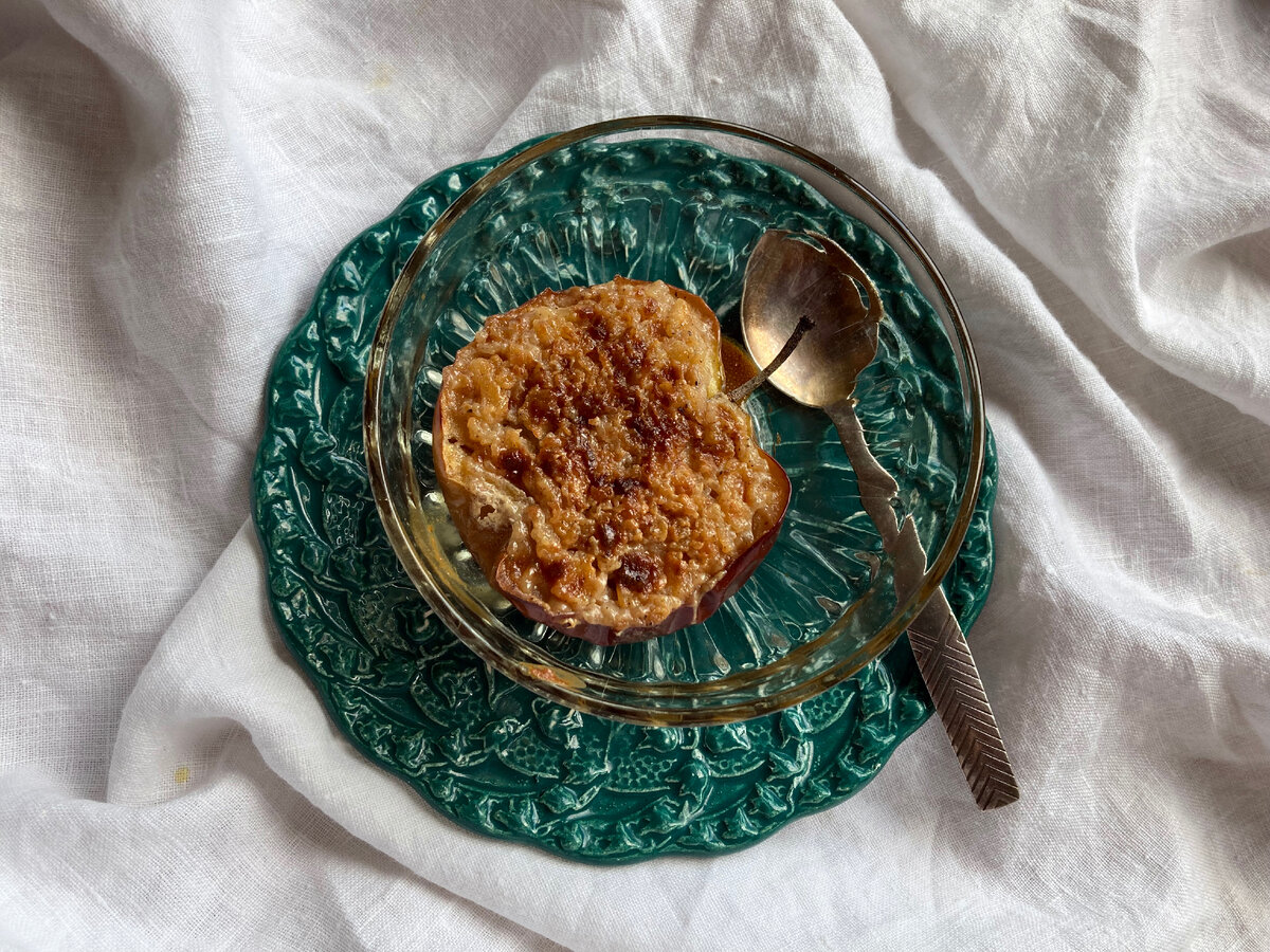 Как видите, если яблоки были разрезаны на половинки и запекались быстро, из них почти не вытекает сок. Но я все-таки предпочитаю запекать их в порционных емкостях, в которых потом и подаю, чтобы не перекладывать туда-сюда.