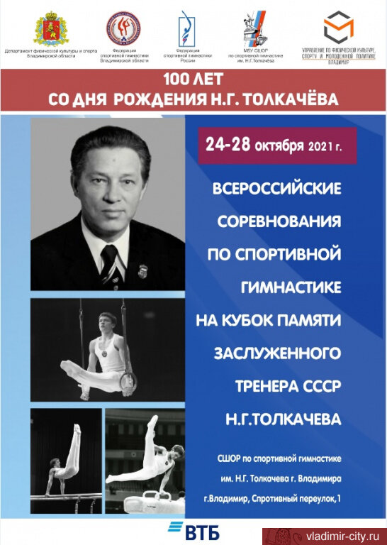 Приурочены к этой дате как спортивное, так и два памятных мероприятия 25 октября исполнится 100 лет со дня рождения Николая Толкачёва — тренера, основателя владимирской школы спортивной гимнастики Олимпийского резерва В школе разыграют Кубок его памяти, а ещё — откроют мемориальную доску в его честь, но уже не в школе. Непосредственно в день рождения Толкачева пройдут памятные мероприятия. На Аллее славы кладбища Улыбышево, где похоронен тренер, возложат цветы к его могиле. Памятная церемония начнётся в 8:30. На доме, где он жил — улица Большая Нижегородская, дом 32 - в 11 часов торжественно откроют памятную бронзовую доску. А вот в школе, которую в 1961 году Николай Толкачёв основал вместе с супругой, Любовью Толкачёвой, 24 - 28 октября состоятся Всероссийские соревнования по спортивной гимнастике на Кубок памяти Николая Толкачёва. «За время работы владимирской школы гимнастики ее воспитанники завоевали десятки наград самого высокого уровня, в том числе 26 олимпийских медалей, из кото