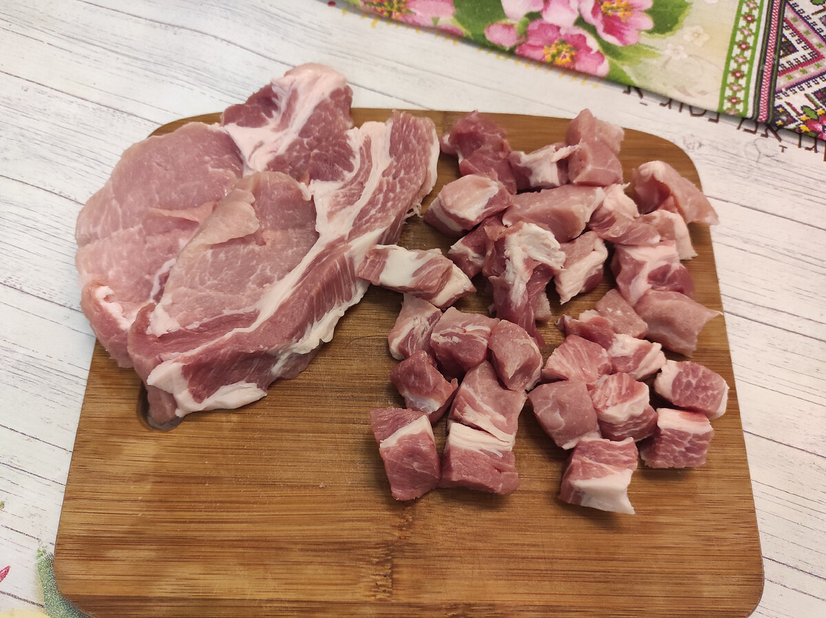Мясо хорошо вымыть, обсушить и нарезать небольшими кубиками.