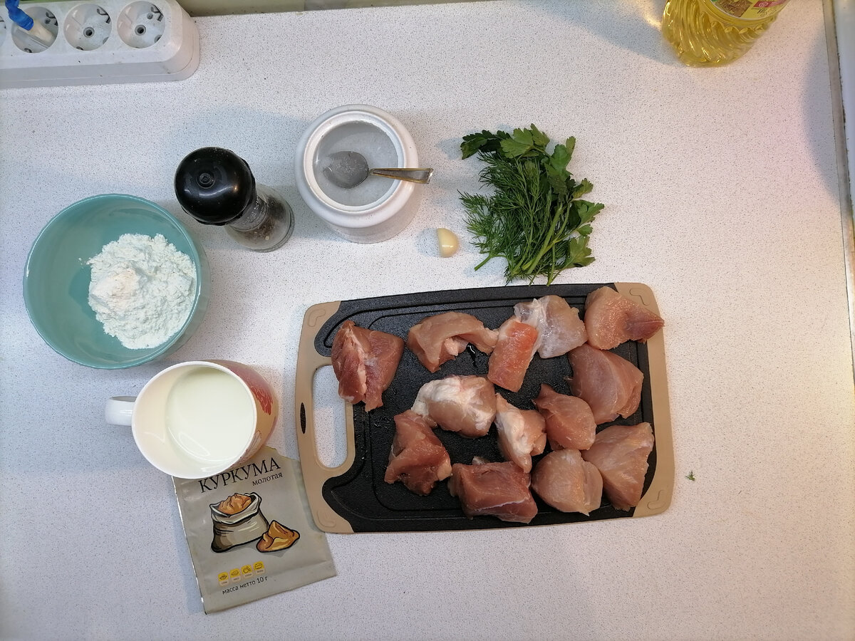 Готовим вкусный и сочный ужин. Для этого рецепта подойдёт как курица, так и свинина. Мясо получается мягким и сочным. Нам понадобится : Куркума по вкусу Соль/перец по вкусу Мука 4 ст.л Мясо 300г Зелень Молоко 1 стакан Чеснок 1 зубч. Подготавливаем все ингридиенты. Режем мясо крупными кусочками. В пакетик насыпаем муку, куркуму, соль и перец. Хорошо перемешиваем. В этот пакет перекладываем мясо и смешиваем так, чтобы все мясо покрылось приправами. На раскаленой сковороде обжариваем мясо до золотистой корочки. Пока жарится мясо приготовим заливку. Для этого чеснок и зелень измельчаем В стакан с молоком добавляем. Когда мясо покрылось корочкой, заливаем молоко и переодически помешивая готовим в течении 15 минут Приятного аппетита ❤️ Подписывайтесь на мой канал и Готовьте вместе со мной! До новых встреч.