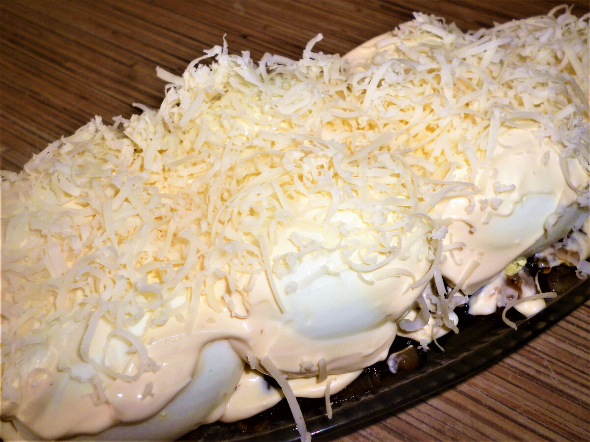 Эта закуска - всего лишь вариант подачи известного салата из баклажан. Но, что интересно, в таком виде она съедается вся, до последней крошечки. На всякий случай напомню, о каком салате идет речь. Обжаривается лук, обжариваются кубики баклажан. К ним добавляются отварные яйца. Все смешивается, салат заправляется майонезом. Все! Я же подаю такой салат в виде закуски. Ее можно подать даже гостям, и успех обеспечен! Фишку с вареными яйцами я когда-то вычитала у Иоанны Хмелевской, моей любимой польской писательницы. Пани Иоанна утверждает, что какие бы шедевры не были поставлены на стол, самым большим успехом будут пользоваться отварные яйца под майонезом. И это - действительно так! У нас сей факт служит постоянным поводом для застольных шуток. Когда-то я уже писала, как по совету Хмелевской добавила отварные яйца к салату из сельди и картофеля. Этот салат и так у нас весьма любим, но когда я разложила по краю блюда половинки отварных яиц и залила их майонезом - это был фурор! Статья здес
