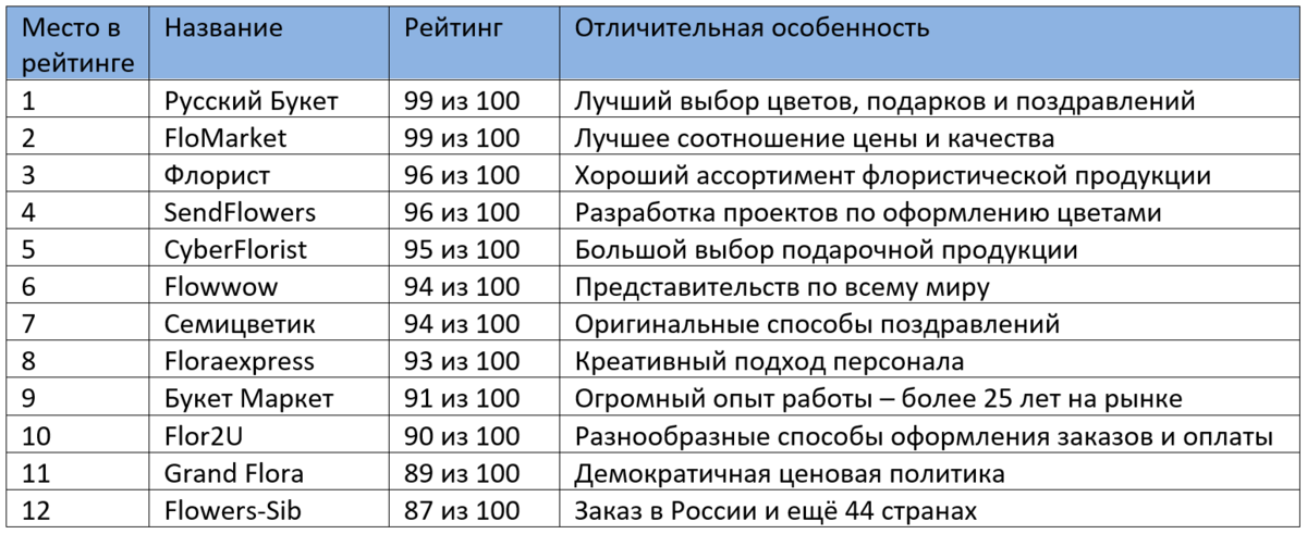 В списке также приведен рейтинг флористических компаний, полученный на основании отзывов клиентов и обзоров экспертов. Для каждой компании также указана характерная особенность сервиса, выделяющая её среди других.