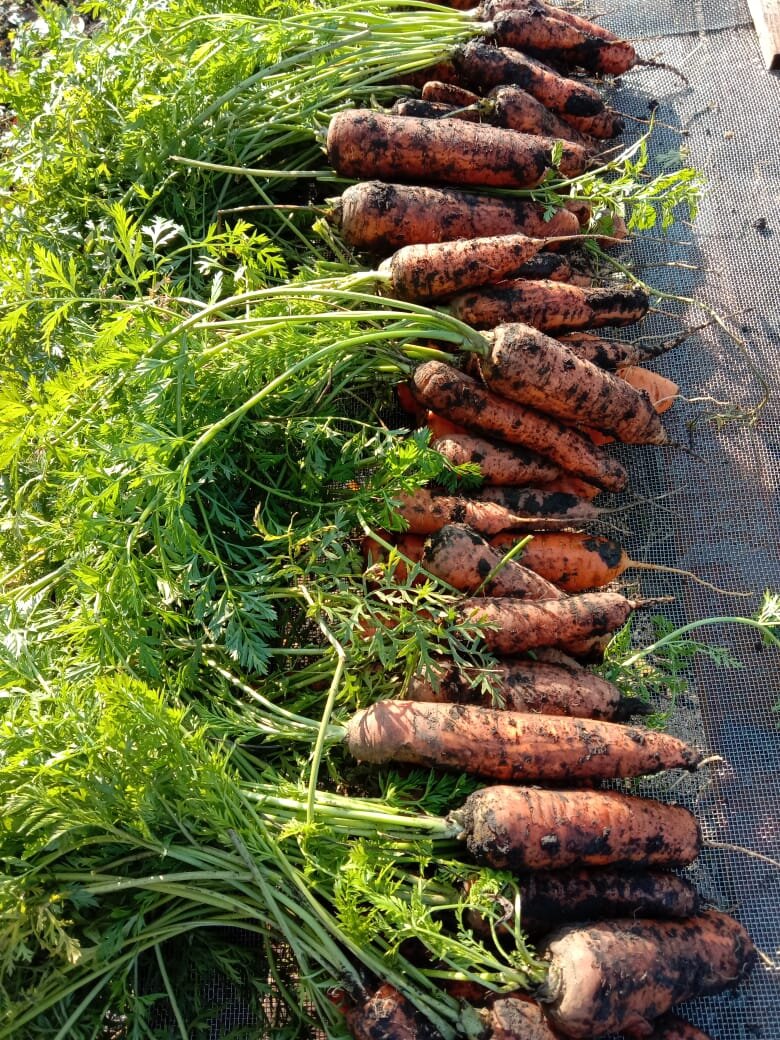 С детства знакомая всем загадка о моркови. Сидит девица в темнице, а коса на улице. Добрый день, друзья! В этот прекрасный день золотой осени убираю морковь. Времени набраться ей сочности и сладости было достаточно. Аккуратно выкапываю её и раскладываю немного подсыхать Морковь удалась на славу. Действительно, красавица! Ровная, крупная, без растрескивания. Морковь даёт хороший урожай на плодородных почвах с перегноем и песком. Такую грядку я после сбора урожая готовлю на другом месте. На такой грядке и легче бороться с сорняками и проволочником. Вот так очищаю землю от сорняков под будущий урожай моркови, затем насыпаю доломитовой муки, смешанной с песком. При перекопке все слои перемешаются. Морковь не любит плотные почвы с тонким плодородным слоем. Такую почву сложно обрабатывать. А корнеплоды будут коротенькие и уродливые. К сожалению, совсем немного, но есть и такие экземпляры. Такой результат ожидаем при недостатке влаги после появления всходов. Ночью почва влажная, а днём перес