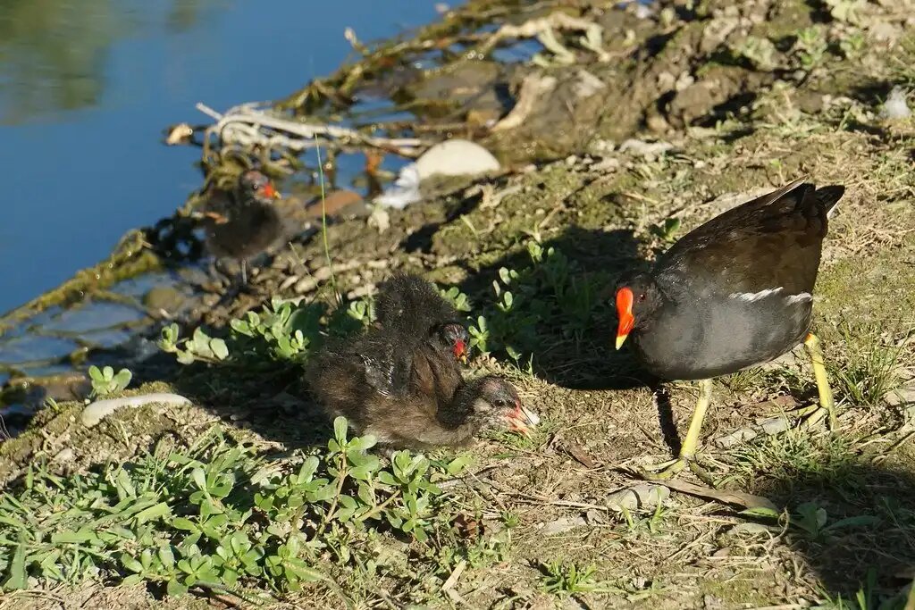 В Адлере мне очень нравится парк "Южные культуры". Неудивительно, что среди вековых эвкалиптов, кипарисов и платанов нашли себе дом многие птицы. Про встречу с одним обитателем парка я и хочу сегодня рассказать. Однажды на прогулке мы увидели маму-утку с птенчиками. Точнее, я решила, что это утка, так как птенцы плавали в воде. А на самом деле это - камышница. Её ещё называют болотной курочкой. По латыни она называется Gallinula chloropus, что означает "зелёная курочка". Отряд: Журавлеобразные Семейство: Пастушковые Род: Камышницы Вид: Камышница Вообще, эта птица считается довольно пугливой. Но в парке они чувствовали себя комфортно и никак не реагировали на людей. К людям птицы привычные, а вот общество других пернатых не особо любят. Камышницы избегают сообщества других птиц, в том числе и того же вида. Лишь во время зимней миграции они могут временно скапливаться в одном месте до 20 (редко до 50) пар, но даже и в этом случае сохраняют между собой дистанцию 1—5 . В остальное время в