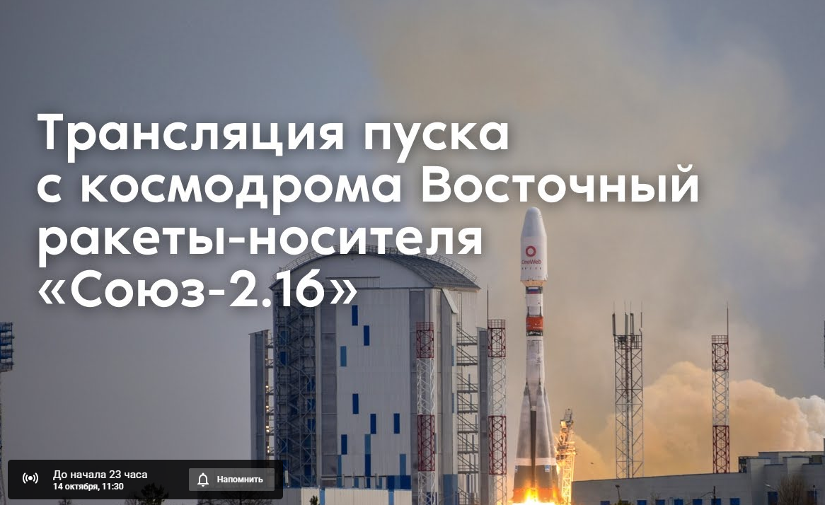 Пуск ракеты-носителя «Союз-2.1б» с разгонным блоком «Фрегат» и 36 космическими аппаратами спутниковой компании OneWeb на борту запланирован на 14 октября 2021 года в 12:40 по московскому времени. Он станет шестым полностью коммерческим пуском с космодрома Восточный. Разгонный блок «Фрегат» доставит 36 аппаратов OneWeb на высоту 450 км, после чего спутники выводятся самостоятельно на орбиты в 12 заданных плоскостях. Начало прямой трансляции: 11:30 мск на канале Роскосмос ТВ.