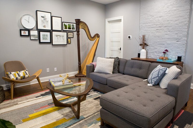 Стефани изучала арфу в колледже, и это сразу привлекает внимание в этом пространстве.