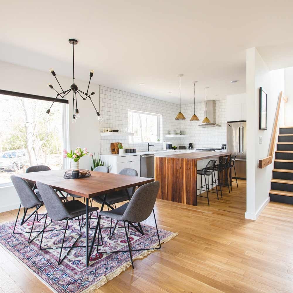 Бриттани и Джефф Китчен, нашли идеальное место для собственного жилья после того, как в течение года осматривали участки. Недвижимость расположена на причудливой обсаженной деревьями улице в Ротсее, штат Нью-Брансуик, Канада, усеянной классическими домами с видом на реку Кеннебекасис. Собственный дом мечты, обставленный в современном стиле, должен был вписываться в контекст соседних домов в стиле середины века, которые будут его окружать. Поначалу некоторые соседи были не слишком довольны тем, что строится этот дом, и многие возражали против современной эстетики. По мере того как дизайн обретал форму и Китчены переезжали, они чувствовали определенный сдвиг в восприятии сообщества. “Соседи стали более активно участвовать и интересоваться тем, что будет дальше, незнакомые люди заходили, чтобы спросить, откуда мы получаем материалы, и в результате мы завели новых друзей”, - объясняет Бриттани. Этот дом обеспечивает идеальный образ жизни для пары и их щенка Руби. Он не слишком большо