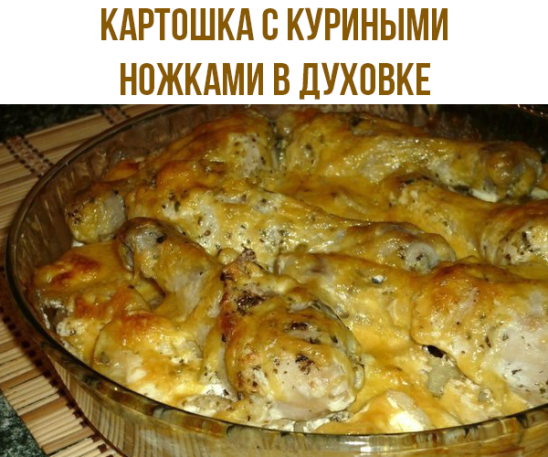 Этот отличный рецепт особенно понравится любителям вкусной картошки с мясом. Картошечка получается очень аппетитной, румяной, а куриные ножки - сочными и мягкими. Прекрасное блюдо для семейного обеда или ужина. Просто и очень вкусно! Для приготовления картошки с куриными ножками в духовке понадобится: 6 куриных ножек; 1 кг картофеля; 250 г сметаны; соль, сухие травы, перец - по вкусу; 2 зубчика чеснока; 300 г сыра. Куриные ножки солим, перчим, посыпаем сухими травами, добавляем чеснок, пропущенный через пресс, и сметану. Перемешиваем и оставляем минут на 30. Очищенный картофель режем достаточно тонкими кружками, солим, перчим, выкладываем в жаропрочную форму. На картошку выкладываем куриные голени, закрываем форму фольгой и отправляем в разогретую духовку при температуре 180-200 градусов на 45 минут. Затем достаём форму из духовки, снимаем фольгу, посыпаем натёртым сыром и отправляем в духовку ещё минут на 20. Картошка с куриными ножками, приготовленная в духовк