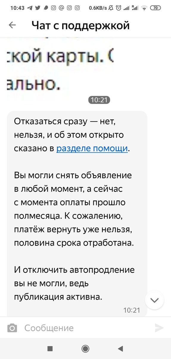 Проверяю я как обычно раз в месяц банковские выписки, и нахожу платеж #ЯндексНедвижимость ?? Думаю странно... вроде ничего не размещала в сентябре, а августе было, а в сентябре не было, размещала объявление о продажи дачного участка. По привычке, оплачивая что-либо, я всегда убираю автоматические платежи. Поэтому точно знаю, что автоматических списание у меня быть не должно. Уточняю у техподдержки #ЯндексНедвижимость, и получаю ответ как на принтскрине... "Отказаться от автоплатеж невозможно!!! Так как это указано в разделе помощь на сайте». Указано, блин, мелким шрифтом, чтобы никто не догадался и не дочитал при публикации платного объявления. На просьбу вернуть деньги обратно на счёт – отказ: вы когда галочку поставили, вы согласились на условия автопродления. Блин! Без галочки невозможно было опубликовать, и я специально выбирала разовую публикацию! Так мелко и неприятно! Сервис не рабочий, как технически, так и с точки зрения наполнения, так и клиентской поддержки нет. Не уди
