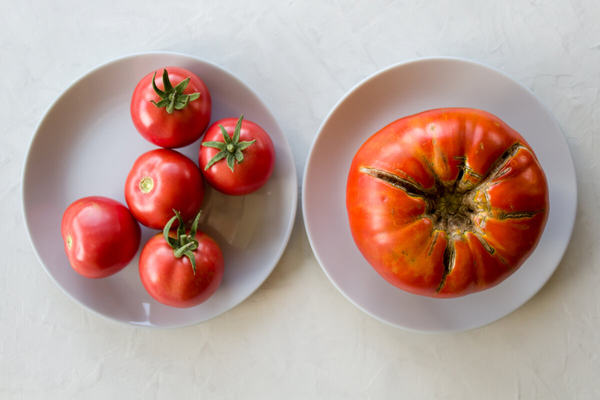 Нередко на созревающих плодах томата появляются рубцы и полоски. Хотя это не отражается на вкусе, внешний вид помидоров страдает. Давайте разбираться в причинах, чтобы следующим летом ваши овощи были идеальными. Итак, деформации и полоски — это не заболевание. А сигнал об ошибках в процессе выращивания: неправильных подкормках, поливе, перепадах температуры, неудачной обрезки и пасынковании. Любопытный факт: рубцы и полоски на томате на английском языке называются «кэйтфэйсинг», потому что образованный ими рисунок похож на полосатую кошачью мордочку. Ошибка 1. Избыток азота Внесение азотных удобрений под томаты стимулирует их рост и быстрое развитие. Но избыток вещества делает ткани растения более рыхлыми, снижает иммунитет, повышает риск развития заболеваний. Кожица на помидорах становится менее прочной и легко растрескивается. Что делать?