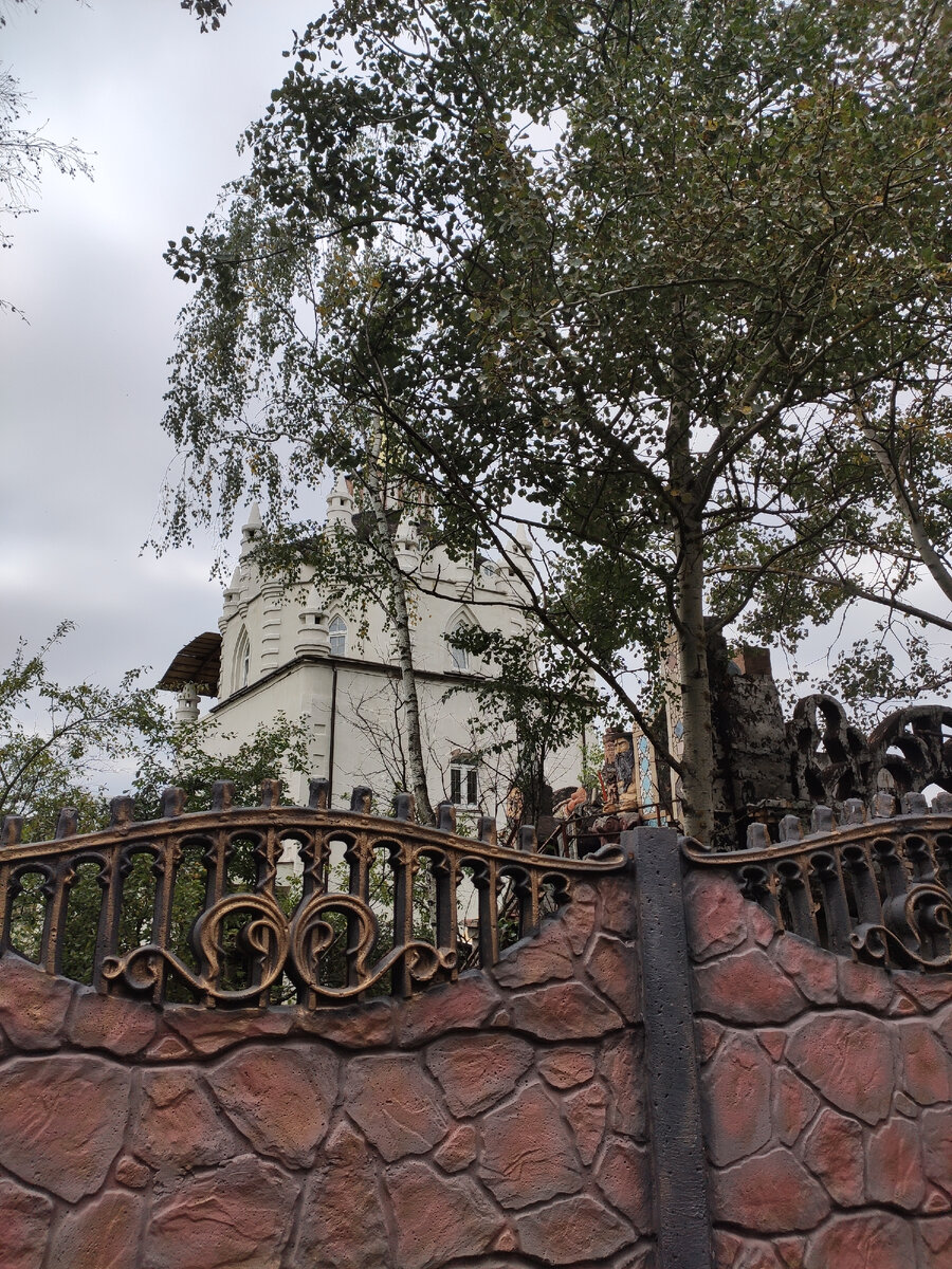 Очередной чудаковатый дом был обнаружен в Московской области. Фотографию этого дома я увидела у знакомого на одной из его велопрогулок и естественно заинтересовалась. Один лишь факт, что до этого дома мне ехать порядка 18 км, а я там ни разу не была, возбудил ещё большие интерес и желание. Одним сентябрьским деньком (если точнее - 11.09) я в сопровождении 2 ребят (один из которых собственно супруг) на велосипедах направились искать этот интересный дом. Просто так мимо него не проедешь, находится он на территории СНТ с незаурядным названием "Весна". При въезде на территорию СНТ на нас устремились взоры многочисленных людей. Откуда тут столько людей? Видимо это что-то типа центральной площади - несколько столов с одеждой, палатки с продуктами, и большая очередь в какое-то административное здание. Мимо этой толпы мы проезжали ещё 2 раза, возможно у людей создалось впечатление, что мы заблудились. Но вернёмся к самому дому-замку. Рассмотреть сам замок не так уж и просто, территория окруж