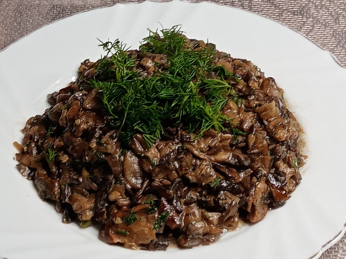 Ингредиенты: Приготовление: Шампиньоны тщательно моем, чистим и нарезаем. Лук мелко шинкуем. Сушеные грибы заливаем теплой водой, а затем измельчаем. Нарезаем лук и обжариваем его на растительном масле. Добавляем шампиньоны, перемешиваем и готовим на среднем огне 15 минут. Затем выкладываем нарезанные и предварительно вымоченные сушеные грибы, солим, перемешиваем и жарим до готовности, примерно 20-25 минут. После этого добавляем сметану, перемешиваем, убавляем огонь до минимального и тушим 5 минут. В конце посыпаем мелко нарезанным укропом и снимаем с огня. Блюдо можно подавать как самостоятельно, так и в качестве гарнира к основному.