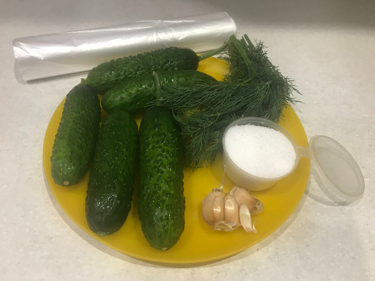 Очень быстрое и простое в приготовлении блюдо. Всем иногда хочется чего-нибудь соленого))) Теперь это можно сделать быстро, и получится вкусно. Советую попробовать приготовить такие огурчики. От них просто не оторваться. Мой список продуктов: 1. У огурцов отрезала кончики с двух сторон. 2. Затем разрезала их пополам поперек, а потом на 4 части вдоль. Люблю маленькие кусочки))) 3. Сразу выложила все огурцы в пакет. 4. Укроп тщательно промыла и мелко порубила. Чеснок очистила и нарезала ножом на очень маленькие кусочки. 5. К огурцам в пакет добавила соль. 6. Далее выложила рубленый укроп и чеснок. 7. Пакет завязала на узел и хорошо, но аккуратно все взболтала. убрала в холодильник на 20 минут. Я открыла пакет через 30 минут, так как занималась другими делами. Как только я это сделала, кухню наполнил свежий аромат огурчиков. Они были съедены за один вечер. Но я в этом никого не виню, потому что огурчики очень вкусные. Вы любите малосольные огурчики?