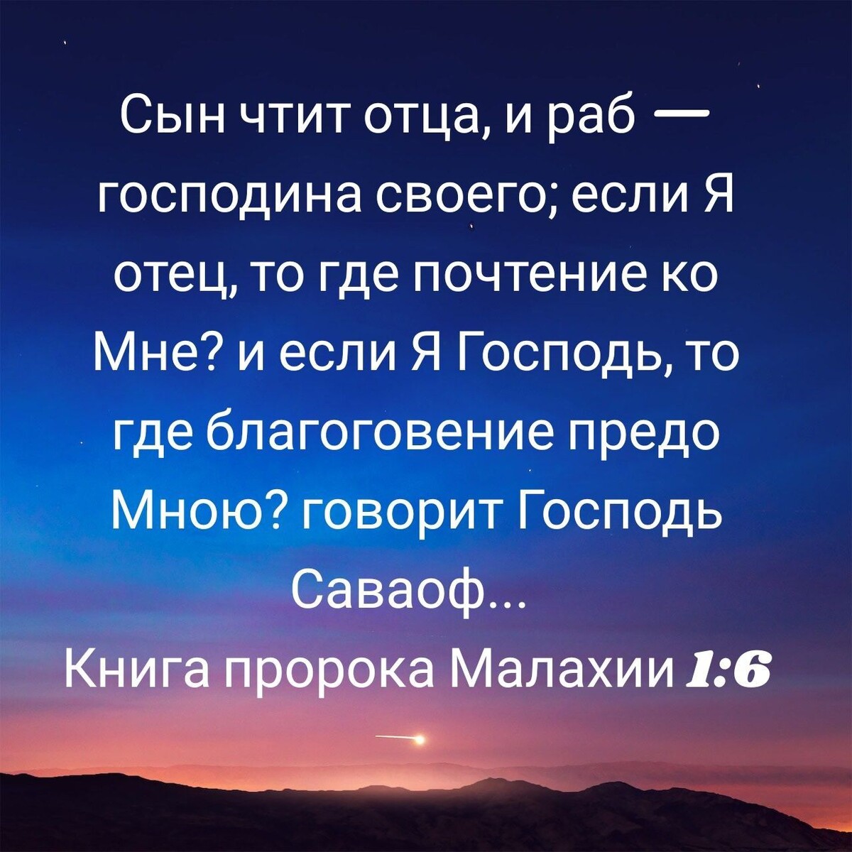 «Сын чтит отца, и раб — господина своего; если Я отец, то где почтение ко Мне? И если Я Господь, то где благоговение предо Мною? — говорит Господь Саваоф вам, священники, бесславящие имя Моё. Вы говорите: “Чем мы бесславим имя Твоё?” Вы приносите на жертвенник Мой нечистый хлеб, и говорите: “Чем мы бесславим Тебя?” Тем, что говорите: “Трапеза Господня не стоит уважения”. И когда приносите в жертву слепое, не худо ли это? Или когда приносите хромое и больное, не худо ли это? Поднеси это твоему князю — будет ли он доволен тобой и благосклонно ли примет тебя? — говорит Господь Саваоф. — Итак, молитесь Богу, чтобы помиловал вас; а когда такое исходит из рук ваших, то может ли Он милостиво принимать вас? — говорит Господь Саваоф».