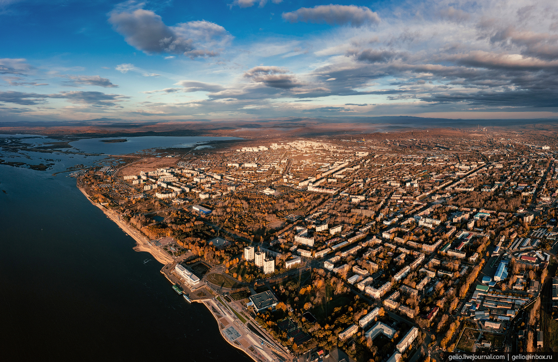 3. Город протянулся вдоль левого берега реки Амур более чем на 30 км. Своим фасадом он обращен к реке, ширина русла которого в черте города достигает 2,5 км.