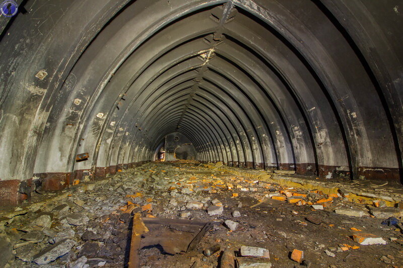 Первым давайте посмотрим что осталось от казармы. Это стометровое сооружение из быстровозводимых сборных арочных железобетонных конструкций, обвалованных землёй. Изначально вход в него был срыт, но позже ещё в 1990-х гг. его раскопали мародёры.