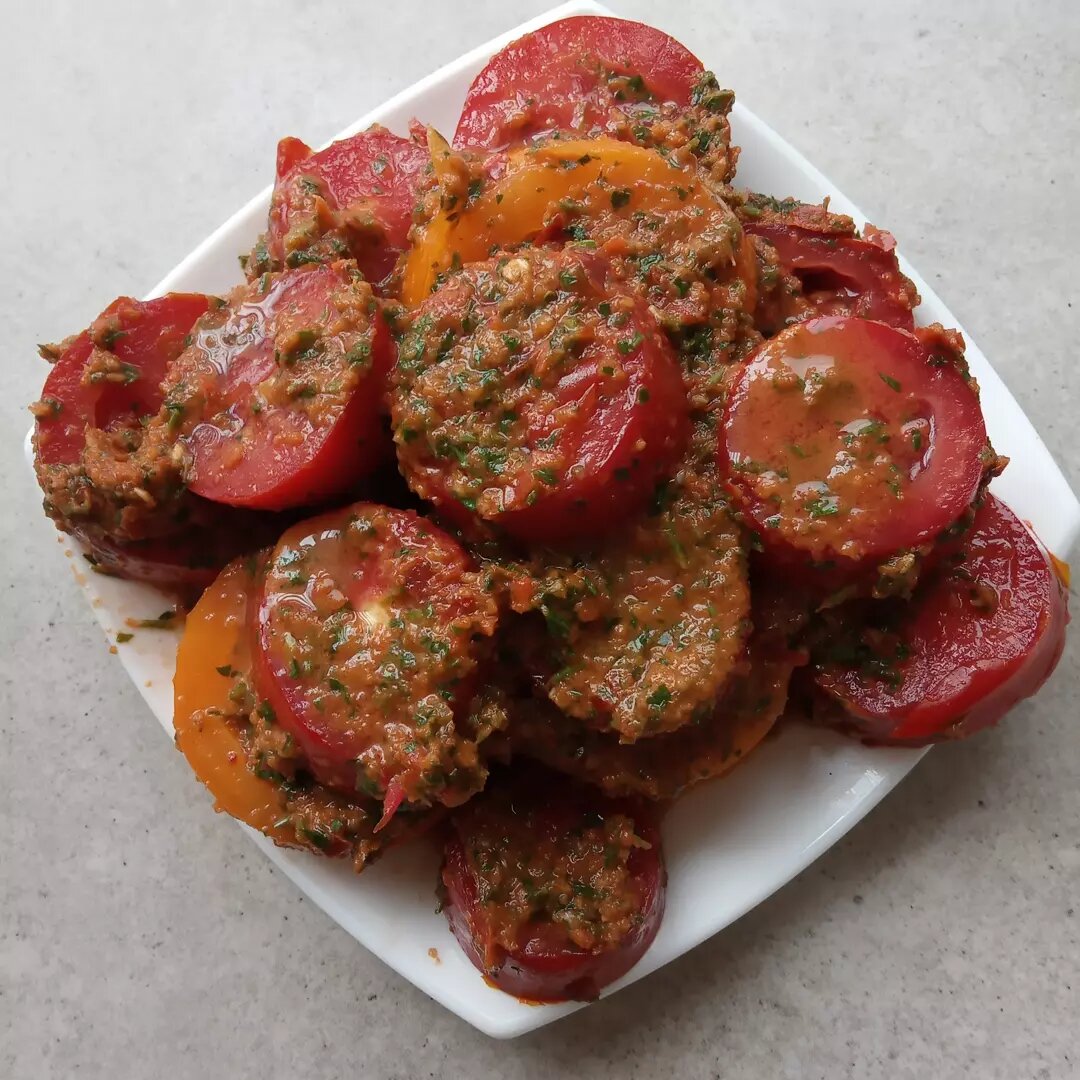 Нам понадобится: Помидоры 2 кг Для маринада: Перец сладкий 4 шт Перец острый 1 шт Чеснок 1 головка Петрушка 1 пучок Масло растительное 2 ст. ложки Соль 2 ст. ложки Сахар 100 г Уксус 6 % - 50 г 1️⃣Все ингредиенты для маринада измельчить блендером. 2️⃣Помидоры нарезать кружочками. 3️⃣Залить помидоры маринадом и поставить в холодильник на 8 часов. Таким образом можно приготовить любые овощи. Только если это будет цветная капуста, брокколи, баклажаны или кабачок их нужно будет предварительно отварить до полуготовности. Приятного аппетита! Каталог рецептов Каталог огородника Каталог по вязанию #помидоры острые #рецепты закусок #рецепт помидор