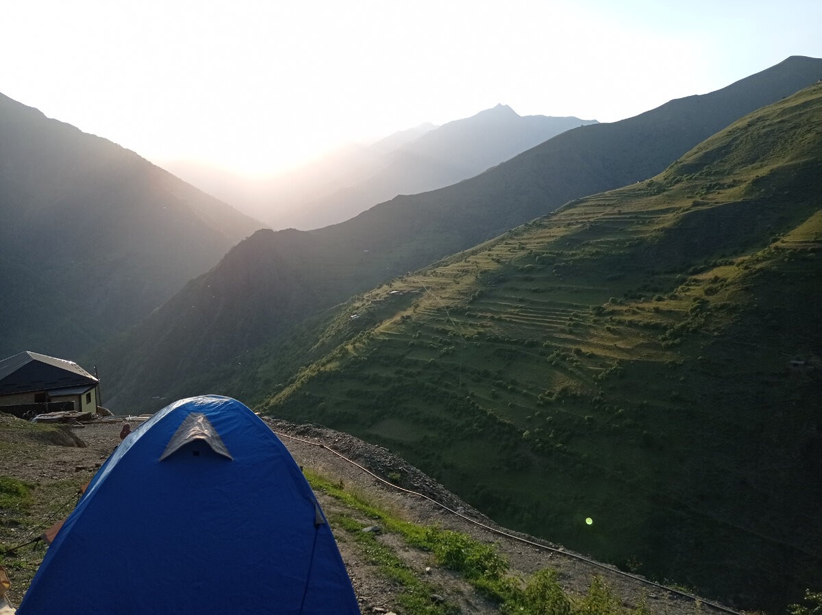 Всем привет! В предыдущей статье я писала как мы попали в Сильди (родное село Хабиба Нурмагомедова), встретили там нереальный закат и заночевали на окраине села в палатке... Так вот продолжу... Напомню, что по не знанию мы поставили наш переносной домик в том месте, где утром и вечером проходит стадо коров. Вечером всë прошло без происшествий, но на всякий случай мы сразу уточнили у пастуха: "во сколько они пойдут утром? " Он сказал, что часиков в 6-7! Ну и отлично, заведем будильник на 6, чтоб наверняка! Поскольку нам также сказали, что звери (медведи, волки, кабаны) близко к селу не подходят, то спали мы спокойно/не настороженно, почти не просыпаясь! Но в один момент, я поняла, что около палатки кто-то ходит и как будто нюхает, первые мысли в такие моменты ужасны: "за нами пришëл медведь!!! ". Я в миг разбудила Винни, на улице было уже светло, высунулись из палатки и увидели, что это корова бодро жуëт траву прям около нас. Глянули на часы и заметили, что время только начало шестог