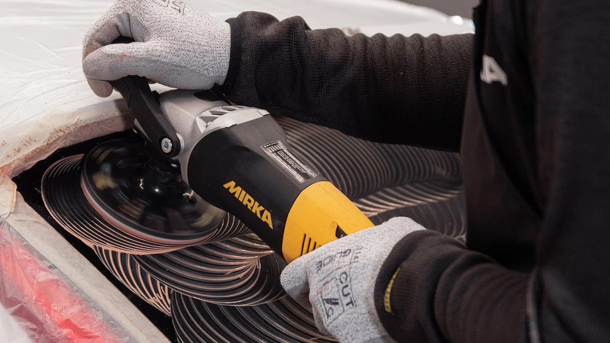 Для работы мы используем электрическую полировальную машинку Mirka PS 1437 с жёсткой подошвой и со специальным пылеудаляющим кожухом для шлифования. Инструмент подключаем к пылесосу при помощи шланга для отвода пыли.