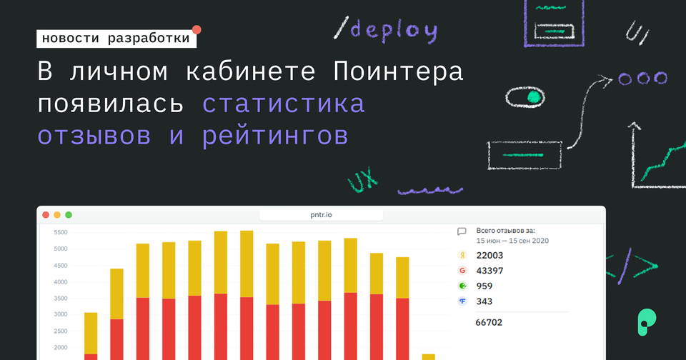 В личном кабинете Поинтера можно посмотреть статистику отзывов и рейтингов. Она доступна как для всей сети, так и для отдельных филиалов, и вот, что там есть. Оценки разбиты по платформам — Яндекс.Карты, Google Карты, 2ГИС и Flamp. Можно узнать, сколько оценок получено за выбранный период, и когда именно. Они группируются по дням, неделям и месяцам — удобно, чтобы искать глобальные тренды и выяснять причину резкого изменения среднего рейтинга (ну а вдруг). Отзывы разбиты не только по платформам, но и по тональности. Можно посмотреть, сколько отзывов пришло за выбранный период с каждой платформы, и какое в них выражается отношение к компании — негативное, нейтральное или позитивное. Всё это вместе показывает срез репутации компании на геосервисах. Ах да, классный бонус — все данные можно выгружать в виде таблицы, чтобы анализировать дальше.
