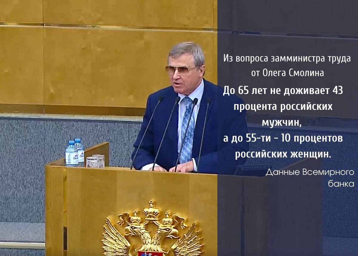 Сегодня состоялось мое первое выступление в Госдуме нового созыва. Задал вопрос заместителю министра труда Андрею Пудову по поводу последствия повышения пенсионного возраста и количества людей, которые не доживут до пенсии. Дело в том, что, согласно данным Всемирного банка, до 65 лет не доживает 43 процента российских мужчин, а до 55-ти - 10 процентов российских женщин.