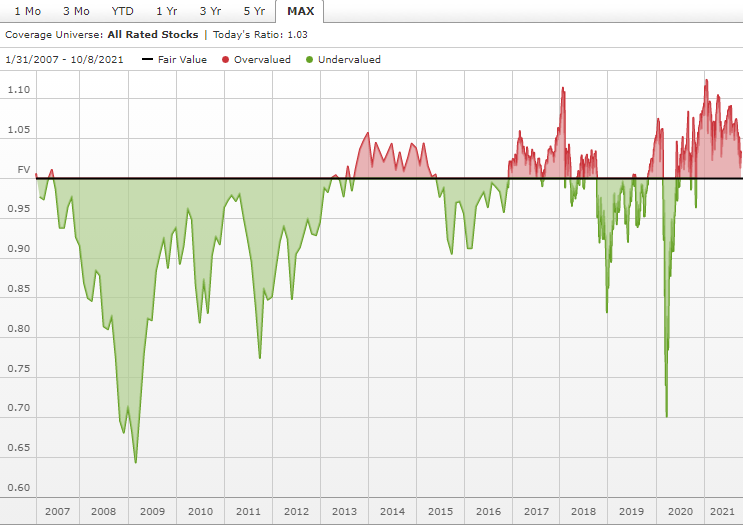 Оказалось, полезная штука! Более полугода назад впервые написал об интересном индикаторе от аналитической компании Morningstar. Называется Справедливая рыночная стоимость (Market Fair Value). Он дает представление как по всему рынку в целом, так и по отдельным секторам. разумеется, анализируется американских рынок. Так вот, тогда индикатор явно сигнализировал, что есть один недооцененный сектор — энергетика. Что случилось с тех пор? Ралли на товарных рынках энергетического сырья и в акциях энергетических компаний. Намерен теперь регулярно мониторить этот индикатор. Давайте посмотрим, как сейчас обстоят дела. Есть ли недооцененные сектора? Как смотреть? Если график в зеленой зоне, то акции в настоящий момент недооценены. Если в красной — переоценены. Как и полугодием ранее почти по всем секторам индикатор в красной зоне. Но удивил один секторов… Давайте пройдемся по порядку. График оценки всего рынка Весь год основные индексы (S&P500, Nasdaq и т.д.) ставят рекорды, немного корректируяс