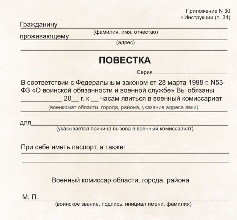 Образец повестки в военкомат выглядит следующим образом: