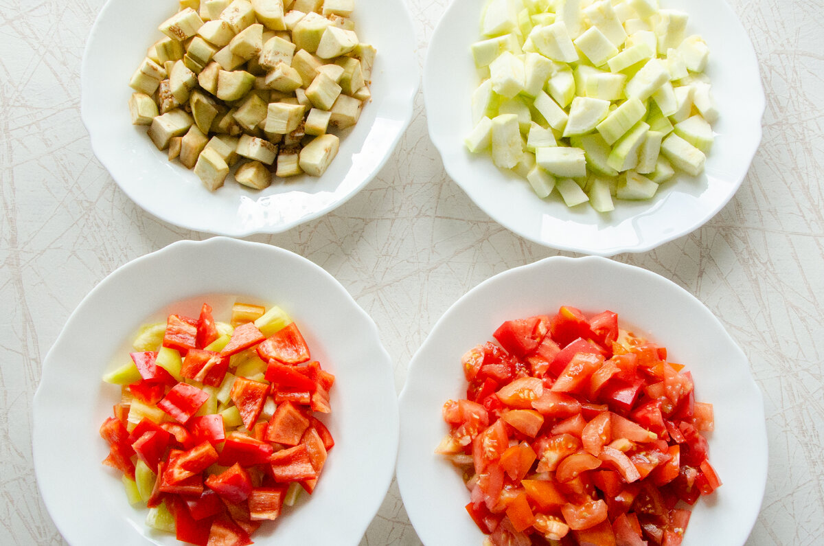 Нарезаем крупными кубиками баклажаны, кабачки, перец. Мелко нарезаем лук, помидоры, чеснок и зелень. Обжариваем на растительном масле лук 2-3 минуты, добавляем баклажаны и готовим ещё 3 минуты. Кладём туда же перец и обжариваем 3 минуты. Добавляем кабачки и готовим ещё 3 минуты.