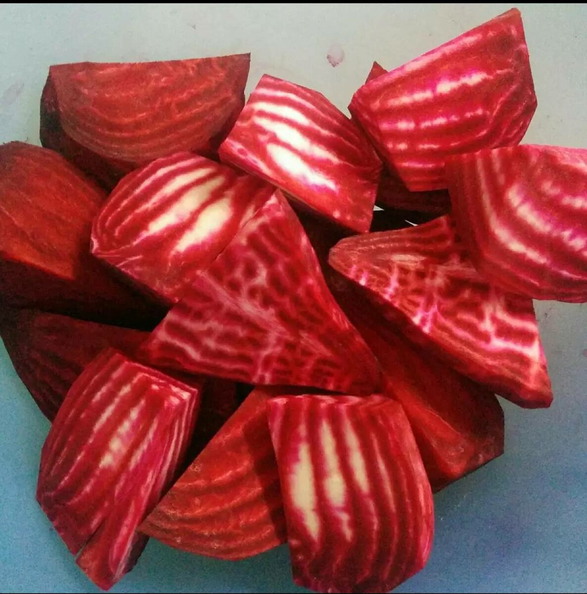 Перед вами очередная #консервация. Маринованная свекла с чесноком. За счёт уксуса великолепно сохраняется истинный свекольный цвет. Сами же корнеплоды на разрезе оказались полосатыми гибридами сахарной свеклы, о чем говорят белые прожилки.