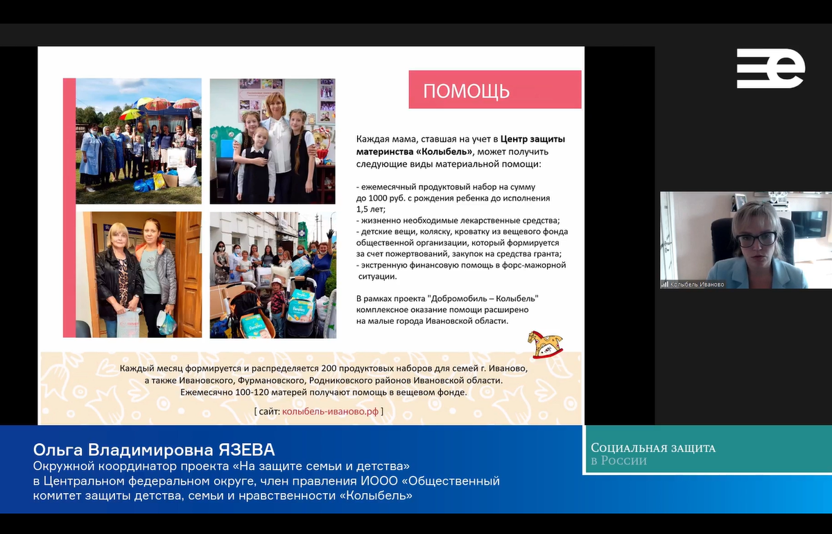 Она выступила на онлайн-конференции «На защите семьи и детства: общественно-государственное взаимодействие», состоявшейся сегодня, 14 октября, и организованной общефедеральным журналом «Социальная защита в России» международного холдинга «ЕвроМедиа» совместно с Ассоциацией организаций по защите семьи. Конференция собрала 8 федеральных и региональных спикеров, более 120 участников из 30 субъектов РФ и была посвящена презентации опыта по развитию и сертификации семейных ресурсных центров в 25 пилотных регионах страны.