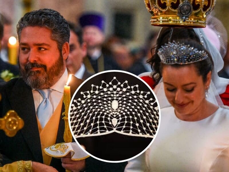 Надевать тиару на свадьбу - западная традиция, современной России не свойственная. Но во времена монархии русские дамы также украшали головы тиарами. Просто после Революции и свержения царя некому и незачем стало носить короны и прочую "царскую" атрибутику. Во времена, когда свадьбы играли без отрыва от производства, тиара нужна была как корове седло. Свадьба Георгия Романова, потомка двоюродного брата Николая II, и Виктории Беттарини представляла собой ядреную смесь русских православных и европейских католических традиций. Поэтому неудивительно, что невеста выбрала такую тиару, чтобы она хоть немного напоминала кокошник. Ведь за русского Великого Князя замуж выходит, ни хухры-мухры. Виктория (Ребекка до принятия православия) выбрала тиару у Maison Chaumet. Потому что этот ювелирны дом в прошлом сделал много украшений для Российского Императорского Дома. Ей предложили на выбор несколько вариантов. По своей форме тиара отдает дань уважения не только русскому кокошнику [традиционная
