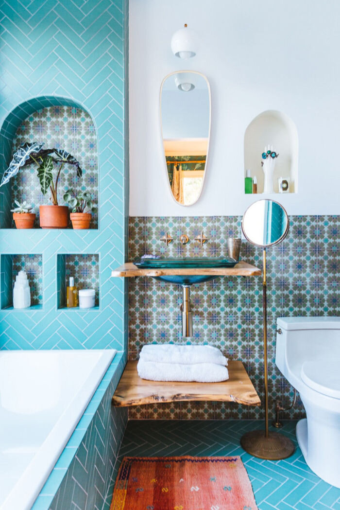 Средиземноморье – это много солнца, моря, зелени и отдыха. И стиль впитал в себя именно эти светлые стороны морского побережья ☀️ Появился он под воздействием греческой и итальянской культур, поэтому имеет некоторые различия по цветовой гамме и материалам. 🌈 Цветовая гамма должна передавать основную идею средиземноморского стиля: легкость, простоту, солнечность и уют. 🇬🇷 Ванная комната в средиземноморском стиле по-гречески будет несколько холодна и выполнена в цветах: синий, голубой, белый, изумрудный, розовый, красный, лимонный. Чёрный цвет допускается в качестве акцента. 🇮🇹 Средиземноморский стиль по-итальянски наоборот приветствует тёплые оттенки: оливковый, желтый, оранжевый, терракотовый, охра. ❗️ На этапе конструктивного планирования ванной комнаты в Средиземном стиле важно предусмотреть арки. Например, арочные окна и двери или даже создать купольный потолок и скруглённую нишу под ванну. 🎨 Отделочные материалы для стен подходят практически любые, но важно их правильно