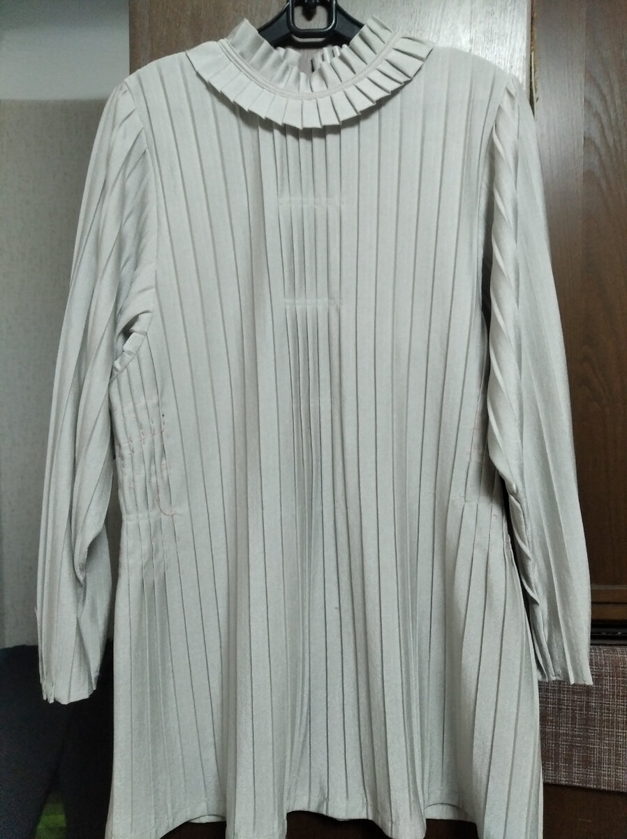 Всем добрый день (утро. вечер)! Сегодня хочу рассказать Вам о работе с плиссированной тканью. А начиналось все так. Просто сшить юбку из отреза плиссированной ткани мне показалось банальным. И я решила сделать блузку (это было несколько лет назад). Сшила по бокам отрезок ткани по объему бедер, а разницу ткани (от ширины объема бедер и груди) решила заложить в складочки (так как ткань плиссированная). Тогда я это сделала таким образом-просто пришила с изнанки тесьму. Вроде и оформила горловину, заложила и прострочила складочки на полочке и спинке. Только не нравилось, как сидит рукав в готовой блузке. Вот теперь взялась закончить эту работу. Недавно купила в магазине тесьму шириной 15 мм с дублирующим эффектом, и там, где закрепляла раньше строчкой складочки тесьмой, приклеила еще и тесьму, чтобы сократить промежутки по вертикали между проложенными строчками. Посмотрите на эти фото с наружной и внутренней стороны ткани. Так как тесьма с дублирующим эффектом, решила проверить, как он