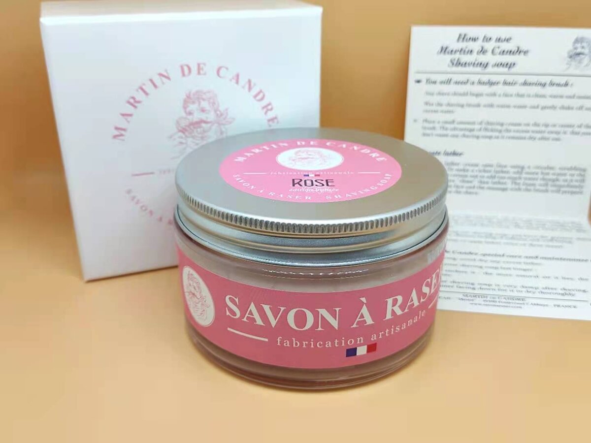 MARTIN DE CANDRE это семейный мыловаренный завод, основанный в 1974 году во Франции, производит различную косметику, в том числе и мыло для бритья. Сегодня на обзоре будет мыло для бритья с ароматом розы. Знакомство с этим мылом у меня началось гораздо раньше, когда я приобрел маленький пробник, грамм на 7-10 примерно, которого мне хватило примерно на 10 процедур бритья! Мне оно понравилось, поэтому было принято решение приобрести полноценную банку в 200 грамм. Итак, мыло поставляется в фирменной коробке из плотного глянцевого картона, на котором с помощью тиснения нанесен логотип компании и название мыла. Сама банка изготовлена из прозрачного пластика, настолько качественно, что с первого взгляда и не отличить от стекла, мыло утрамбовано под самый верх, крышка алюминиевая. Состав довольно простой на первый взгляд, но даже с таким простым составом им удалось сделать просто великолепное веганское мыло Аромат действительно розы, приятный и натуральный, он не сильный и не слабый, прямо во