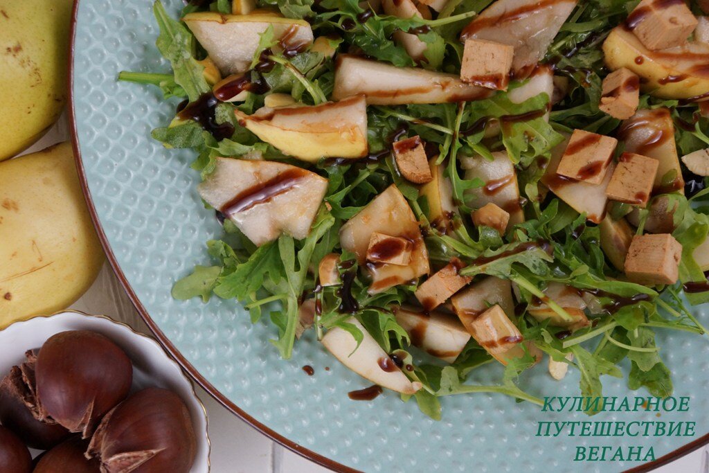 Привет, друзья! Недавно мне посчастливилось купить на рынке очень крупные мясистые каштаны, о которых я давно мечтала. И я решила сделать с ними осенний салат! В нем я соединила несколько сезонных продуктов – груши, каштаны и маленькие кусочки остренького маринованного тофу. Получилось очень сочно и ярко по вкусу! А еще хотела поделиться небольшим лайфхаком как ускорить созревание груш (и других фруктов). Он очень хорошо работает! Я всегда кладу фрукты в картонную закрытую коробку, в которой лежат бананы и яблоки. Это удивительно, но эти фрукты ускоряют созревание других. Пара дней такого соседства и твердые фрукты становятся сочными. Итак, вот рецепт! Как приготовить салат с рукколой и грушей Ингредиенты: 1. Моем рукколу, груши. На каштанах я делаю крестообразные разрезы ножом и 30 минут запекаю в духовку при 200С. Подробно о том, как запечь каштаны я писала тут. Очищаем каштаны. 2. Режем тонко груши. 3. Маринуем тофу – режем тофу на маленькие кусочки, заливаем соевым соусом. Лучше в