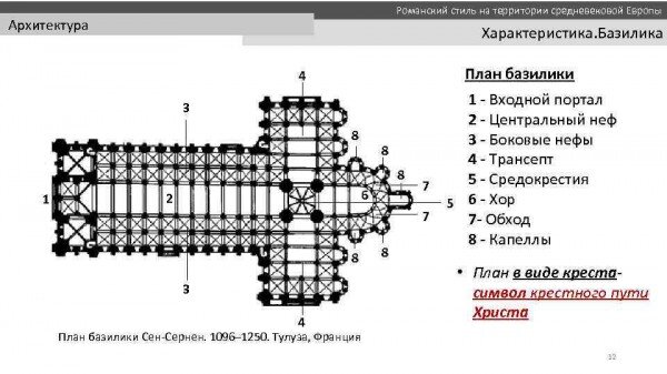 Официальная история утверждает, что здания в романском стиле строили в Европе в период с X по XIII века. При этом ведущим типом церковного здания была как раз базилика. А подобная планировка здания объясняется отнюдь не приверженностью к "католической" символике, а тем, что в месте пересечения главного продольного и поперечного нефов располагали хор. Видимо, из-за каких-то аккустических эффектов. Но при этом во всех крупных храмах этого стиля центральный неф был шире и выше боковых.